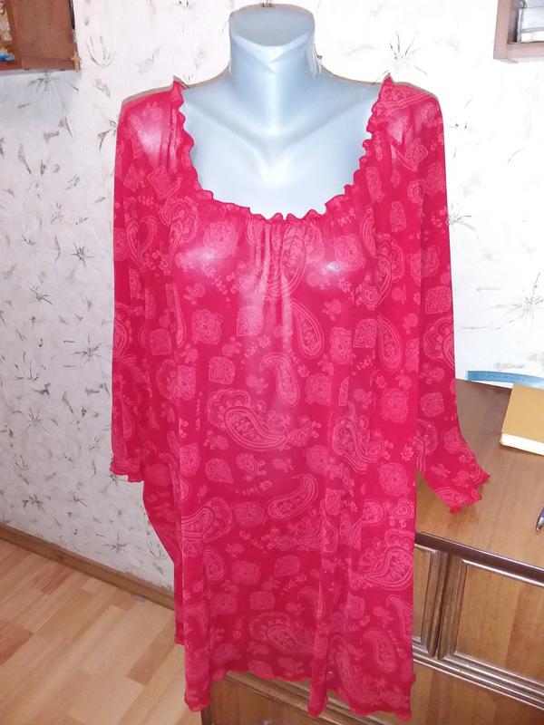 евро размер 50/52. яркий красный цвет. ткань как тонкая сеточка, немного просвечивает. состояние отличное, немного ослабла резинка по горловине, но не критично, с плеч не спадает. длина от плеча к низу 87. длина рукава от горловины 58. п/о бицепса 23. п/о груди 65. п/о бедер 81. 2.