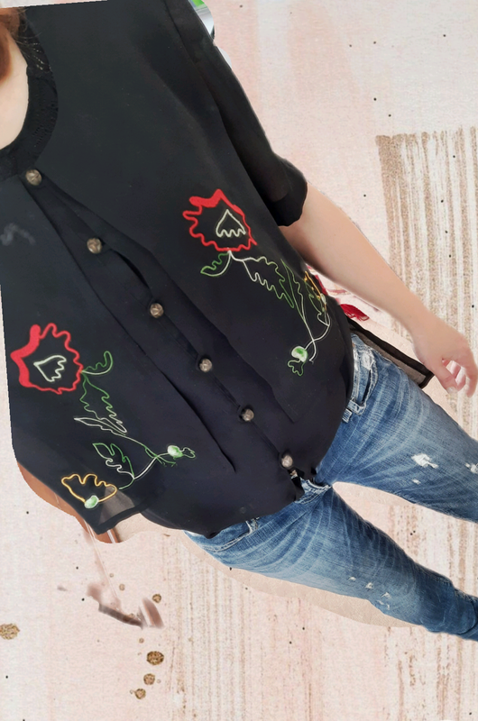 Стильна блузка, ззаду є затяжка,якщо носити заправленою в брюки,то не видно.Плечі 41см,пог 55 см,довжина 70 см,довжина рукава 25см.