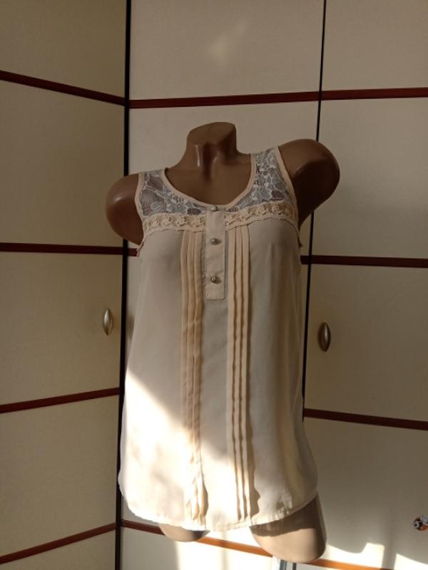 Красива ніжна блузка розмір S(вказаний 8)довжина 61см,пог 44см,в низу 47см,поліестер.,на останньому фото видно невеличкий дифект.