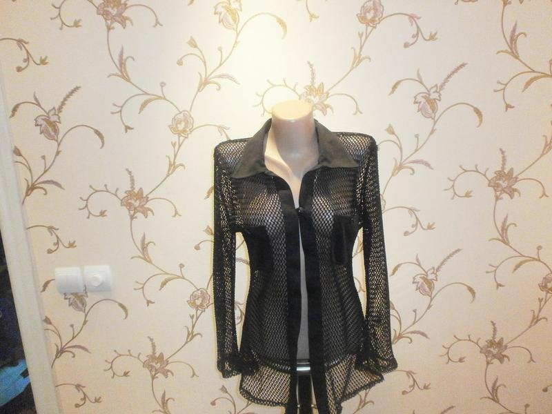 Симпатичная блузочка сетка черного цвета. Актуальна для молодежи, удобная в жаркую погоду, также красиво смотрится на водолазке или легкий свитер. Блузочка легкая приятная к телу. Воротничок и карманчик из плотного шелка-атласа (что-то так). На уровне груди одна застежка. Размеры М и Л .Дополнительно размеры плечи 42-44 см., ПОГ 48 см., длина рукава 57-58 см., длина блузки 64 см.
