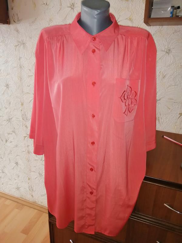 Коралловая блузка, размер указан евро 48, но лучше смотреть замеры. Состояние идеальное, без дефектов. Ткань лёгкая, струящаяся, 100% полиэстер. Длина от верхней точки плеча к низу 82. Длина рукава от плечевого шва 36. П/о бицепса 23. П/о груди, талии, внизу 70. Ширина между плечевыми швами 51. 1.