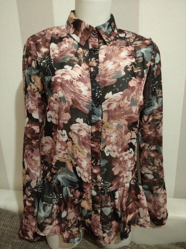 Блузка с красивой расцветкой. Силуэт прямой с рюшей снизу шириной 15 см, с планкой, рукав на манжете. Приятная к телу, как шифон. Размер 40-42. Замеры ПОГ 42, ПОТ 42, ПОБ 42.ДИ 59, рукав 59, регулируется на короткий, плечи 36.