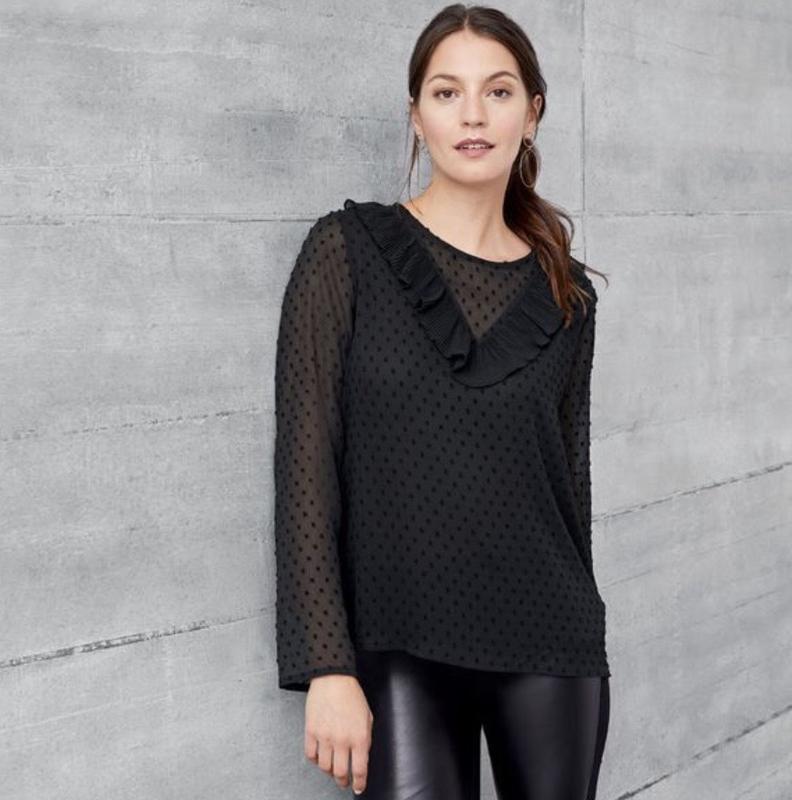 Легкая свободная блуза из актуальной коллекции Esmara. Куплена на официальном сайте. Абсолютно новая, в упаковке с бирками. Ткань легкая, полупрозрачная в мелкий фактурный горошек. С легким подкладом. Есть такая же белая меньшего размера