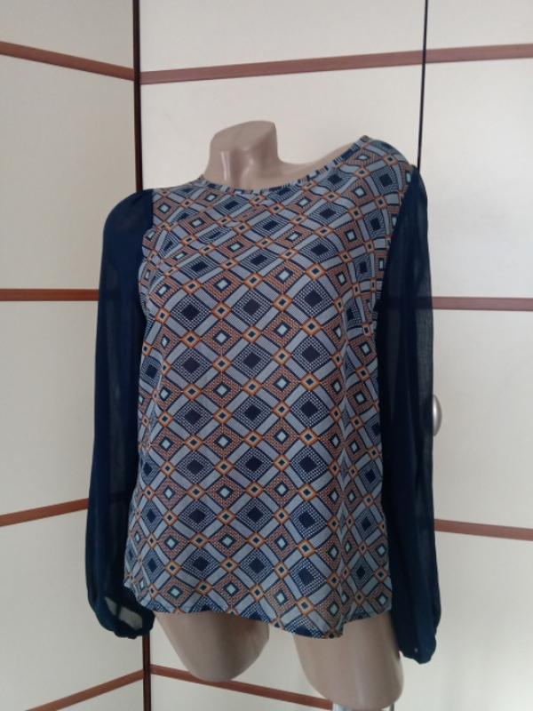 Красива легенька блузка з напівпрозорими рукавами,розмір М-L (вказаний 12)довжина 56см, довжина рукава 60см,пог 48см,в низу 50см,поліестер.