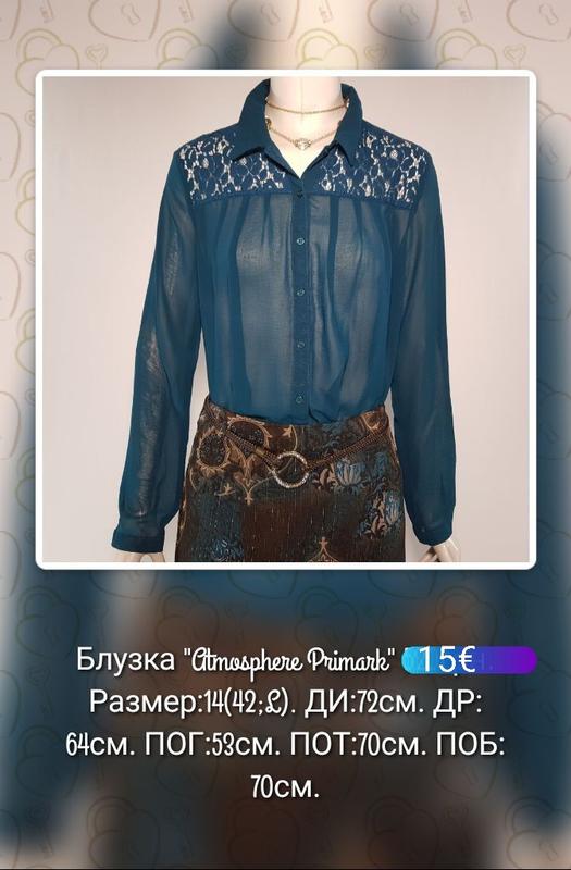 Код: 7-16. Великолепная прозрачная блуза с кружевной кокеткой цвета морской волны ирландского бренда «Atmosphere Primark»! Компания производитель, может быть, не так известна в нашей стране, но те, кто приобрел хоть раз одежду этого бренда, убедились в отличном качестве товаров этого европейского бренда с ирландскими корнями и английскими традициями. Несмотря на то, что блуза выполнена из полиэстера, ткань очень приятная к телу. Кокетка из натурального кружева делает блузу более нарядной. Блуза довольно прозрачная. Застегивается на пуговицы. Рукава с узким манжетом. Блуза свободного кроя. Отлично сочетается с юбками и брюками. Цвет: морской волны (сине-зеленый). ВНИМАНИЕ! Монитор может искажать реальный цвет изделия! Размер: 14 (L-XL). Длина изделия: 72 см. Длина рукава: 64 см. НОГ: 53 см. НОС: 70 см. Состояние: идеальный ( одевалась несколько раз).