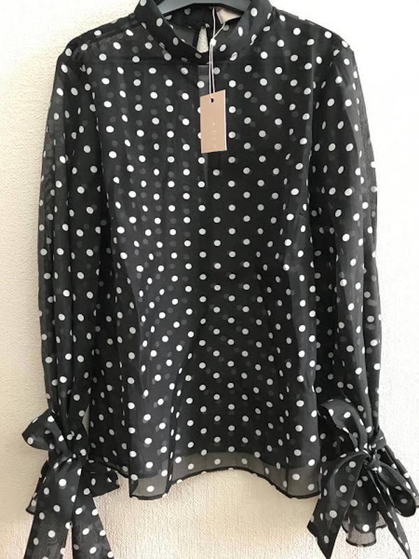 Keepsake нарядная стильная блузка р. 44-46/М Смотрите замеры ! Модная ,стильная блузка черного цвета в белый горошек . Прозрачная ,шелковая ткань . Роскошный рукав расширен к низу и завязывается на милые банты . Блуза модная ,стильная для весенне -летнего сезона . Хороша для будней и торжественных мероприятий .