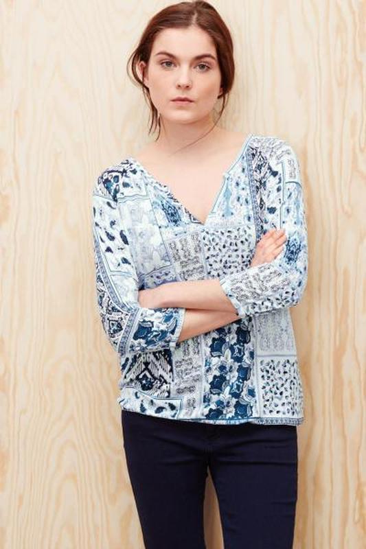 топ от бренда S.Oliver разм. 36 № 09.605.39.6916.59A2 Мерки: плечи 36см. пог 46см, длина 64см, рукав 38см Цвет: сине-голубой узор Вид товара: с бирками Состав: 100% модал