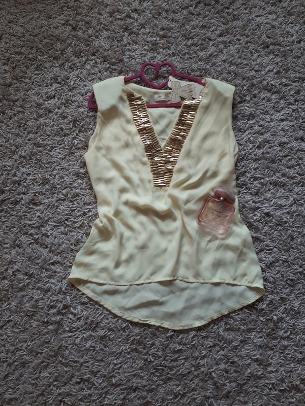 Шифонова блуза.Ніжно лимонного кольору.З шикарно оздобленим вирізом.В районі грудей тканина подвійна,таким чином не прсвічується.З підплічниками.Абсолютно нова. Довжина по спинці 70см,спереду коротше на 2-3см ПОГ 50см.