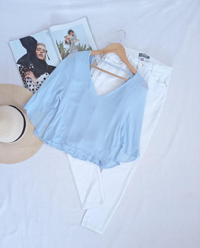 голуба блуза від Zara прямого крою з V вирізом, тканина тонка, в два слої, не просвічує, розмір S, ПО грудей 45 см, довжина 50 см