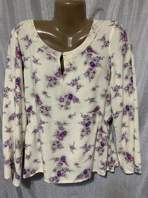 Нежная красивая блуза, в талии на боках присборенная на тонкой резинке. Замеры: длина - 61см., плечи - 40см., рукав - 60см., ПОГ - 53см., ПОТ - 43(53)см., ПОБ - 57см