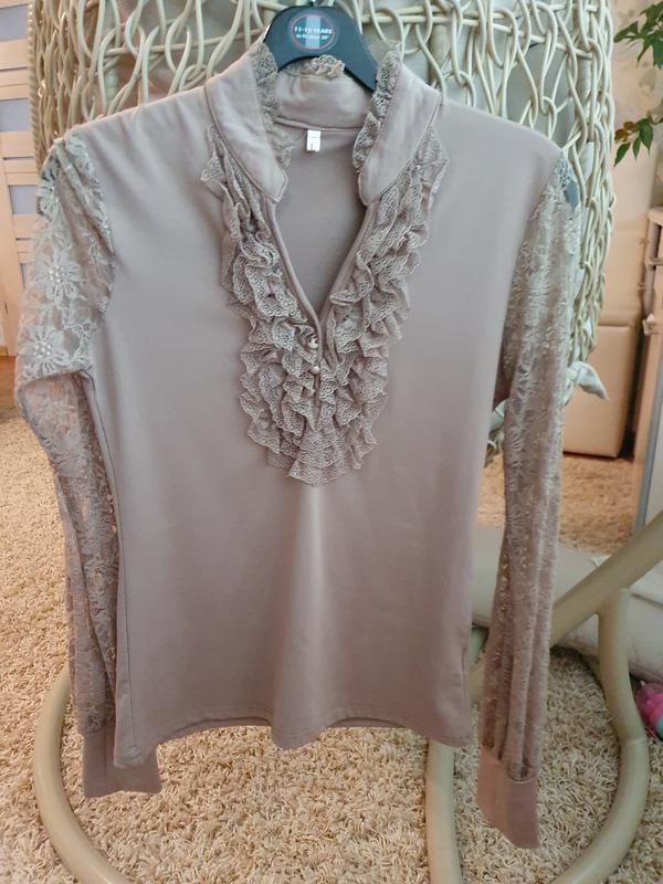 Такі кофти- блузи знову в моді. Блуза з гіпюровими рукавами і збіркою на грудях, з декоративними гудзиками.Рукав йде невеликим фонариком. Колір капучино, какао.Гарно тягнеться і сідає по фігурі, на бірці розмір L, можна на М і S. Заміри на фото. Вдівала декілька разів.
