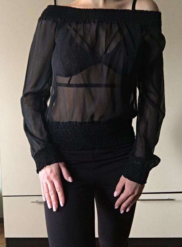 Чёрная прозрачная блуза с открытыми плечами и резинками