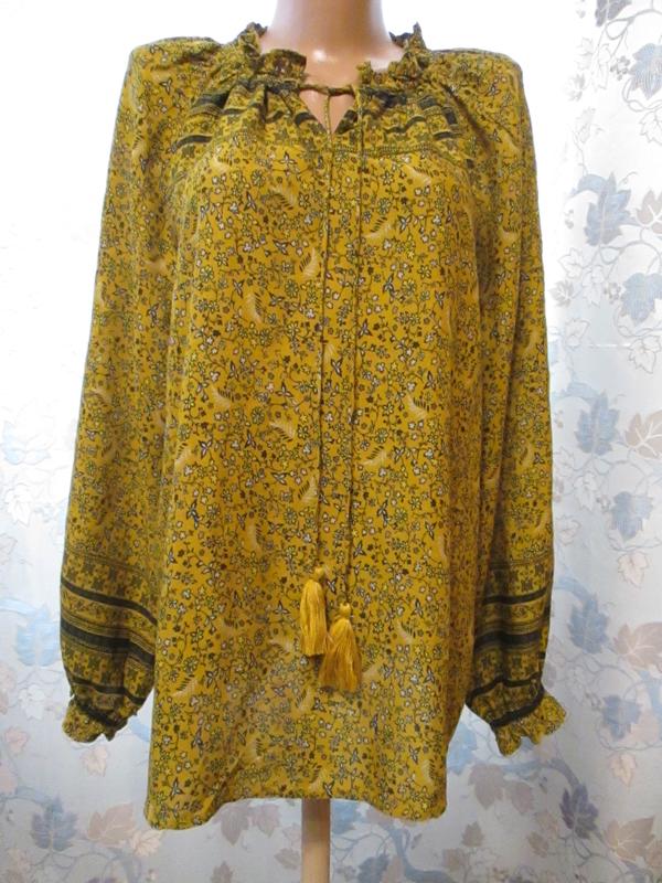 Блуза в идеальном состоянии ярко - горчичного цвета, на 4-м фото реальный цвет. Ткань приятно холодит, струится, приятная к телу. Можно носить как на выпуск так и заправлять. Размер 48-50 Длина - 64 см ПОГ - 54 см ПОТ - 58 см рукав реглан от горловины - 71 см