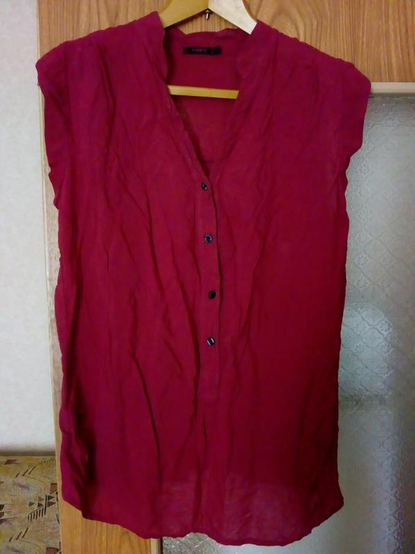 Блуза вишнёвого цвета из тонкой невесомой ткани.Без рукава. Прямой силуэт. Длина (перед) - 72 см, длина по спинке 61 см, объем груди - 52.