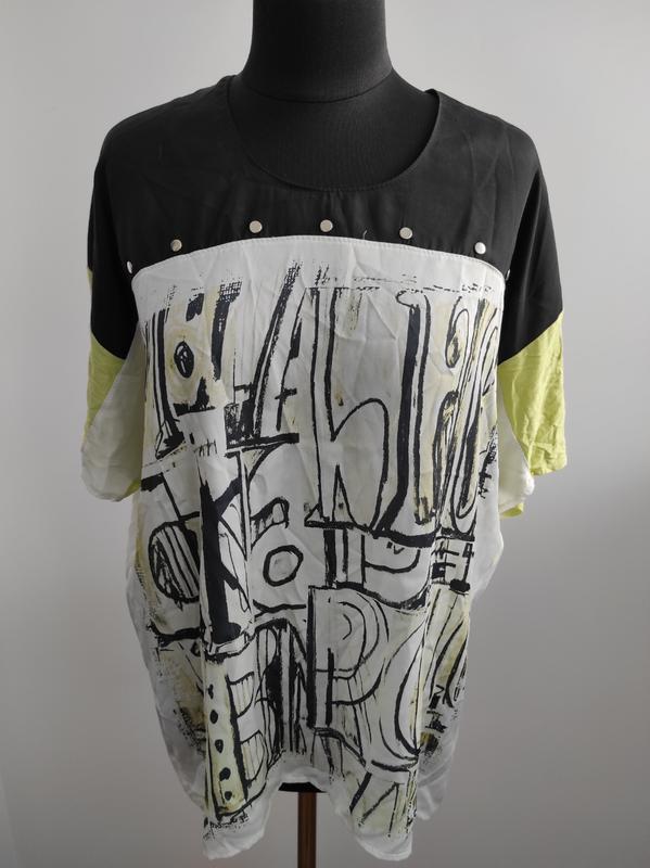 Комбинированная блузка 14 р от wearhouse Размер - 26 Цвет - темно-синий, салатовый белый абстракция Спинка - атлас Перед - атлас, на рукавах трикотажные вставки Длина спинки - 84 см Длина переда - 72 см Пог - 63 см Низ - 60 см Плечо - 42 см