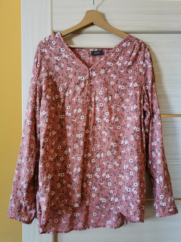 Блуза в цветочный принт с асимметричным низом(спереди короче), пуговки на рукавах и на горловине. Лёгкий приятный к телу материал вискоза.