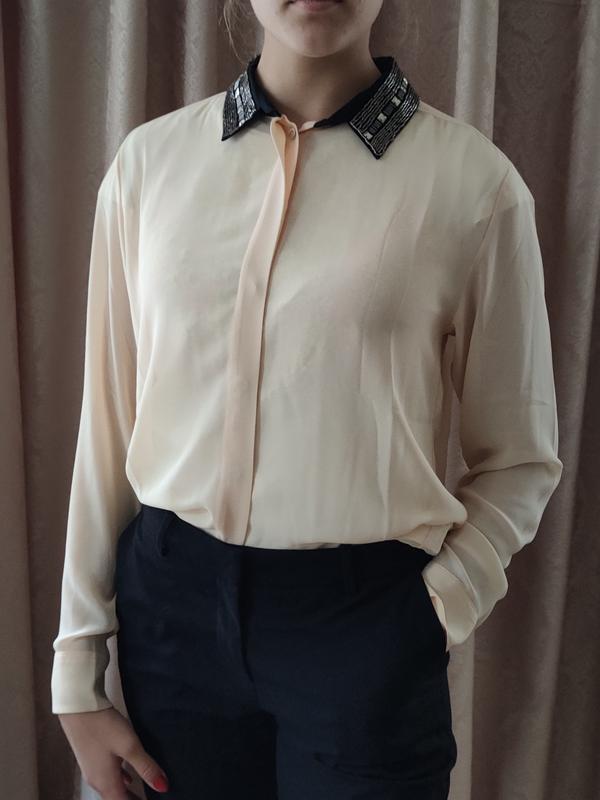 Шикарная новая шифоновая блуза с акцентным воротником теплого бежевого цвета. Размер 38, но можно и 40.Застегивается на пуговки за скрытой планкой. Модель размера М.