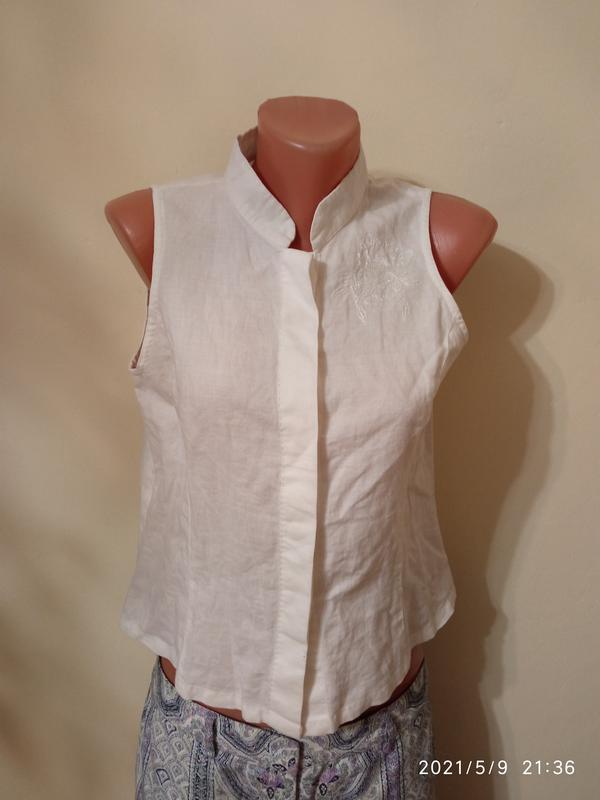 прекрасна, біла блузочка, без бірки, тканина схожа на льон, розмір L, груди 90см, довжина по спинці 50см,в дуже хорошому стані, защіпається на ґудзики, які заховані, комірець стійка