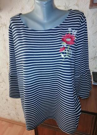 Размер на этикетке XL, но будет на больше, смотрите замеры. Ткань трикотаж, средней плотности, немного тянется, этикетка с составом ткани срезана. Цвет темно-синий, полоски белые. Состояние удовлетворительное, есть кашлатость, видно на последнем фото. Длина от верхней точки плеча к низу 67. Длина рукава от плечевого шва 46. П/о бицепса 18 - 21. П/о груди 60 - 63. П/о талии 62 - 65. П/о внизу 64 - 67. Ширина между плечевыми швами 44. 7.