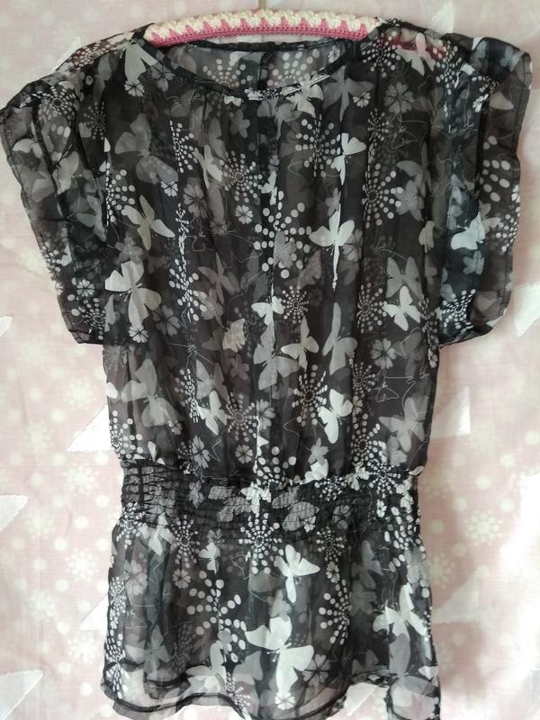 Стильная красивая блузка с цветочным принтом и бабочками.по спинке с разрезом.по талии присобрана на тонких резинках.