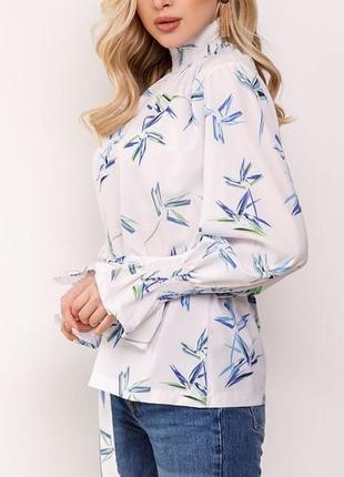 Модель с длинными рукавами декорирована воротником и манжетами с жаткой и воланами. Блуза комплектуется съемным текстильным поясом