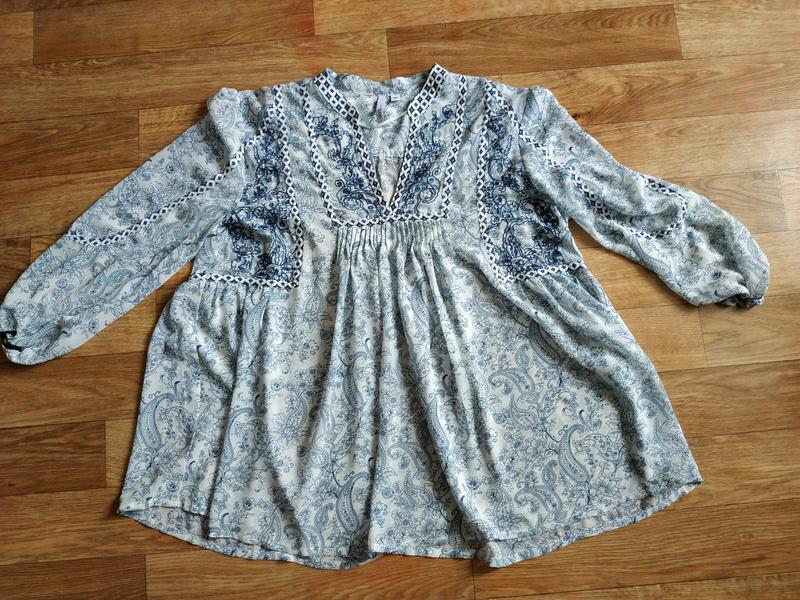 Лёгкая очень нежная блуза свободного покроя с красивой отделкой. Длина 63 см. Длина рукава 46 см.