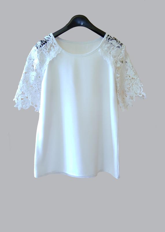 Блуза отличного качества, с красивым кружевом на рукавах Состояние в целом очень хорошее,но есть маленький дефект (еще с магазина) - маленькая тоненькая затяжка (5 фото) на размер М плечи - 40 см ПОГ - 48 см ПОТ - 46 см длина - 62 см ткань не тянется,вискоза