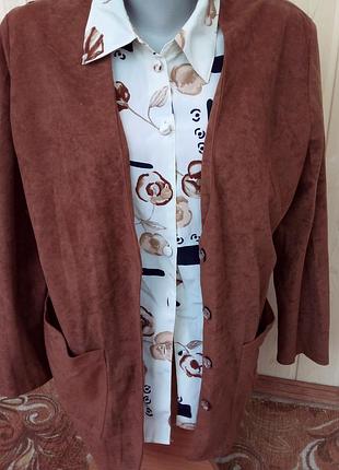 піджак з блузою, обманка, верх - мякий замш, є один нюанс - невелика пляма з внутрушнього боку на спині, але її не помітно (навіть сфотографувати не вдалось), ОГ 106 см, ОТ 96 см, довжина 75 см