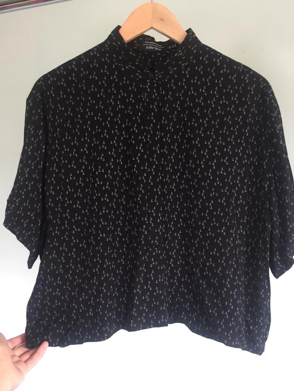 Блуза з 100% віскози. Довжина 53см,рукав 23см,плечі 47см{трохи спущені},пахви 58см{прямий крій оверсайз},комір-стійка 3см. Нюанс вказаний на останньому фото{можна легко виправити}