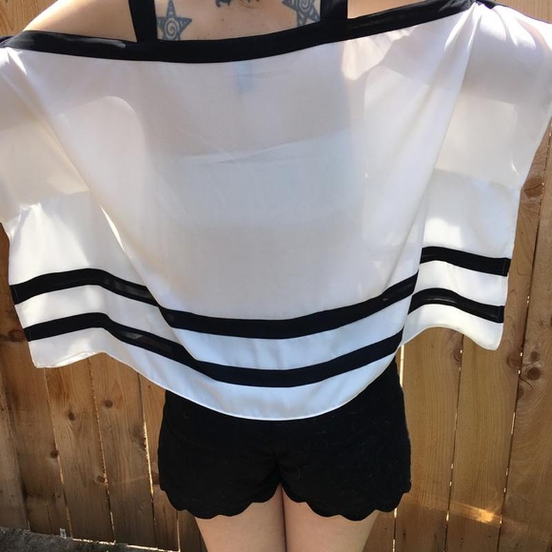 Новая, с бирками, блуза-трансформер, блуза- туника, пончо, с рукавами кроя "кимоно" ( INC International Concepts - США). Дизайн этой блузы позволяет носить ее в 2-х вариантах : как топ без рукавов на бретелях, либо как блуза-пончо , с длинными рукавами "кимоно" и открытыми плечами. Зависит от того, как Вы проденете руки (показано на манекене ) Туника сшита из 2-цветов ткани , где белый - основной цвет, а черный - контрастная оторочка по всему периметру изделия. Этот фасон может рассматриваться на большой диапазон размеров : от 48 до 56, так как ширина изделия очень велика. Состав: полиэстер Доставка за счет покупателя. Отгрузка после частичной или полной предоплаты на мой счет. Возврата и обмена нет.
