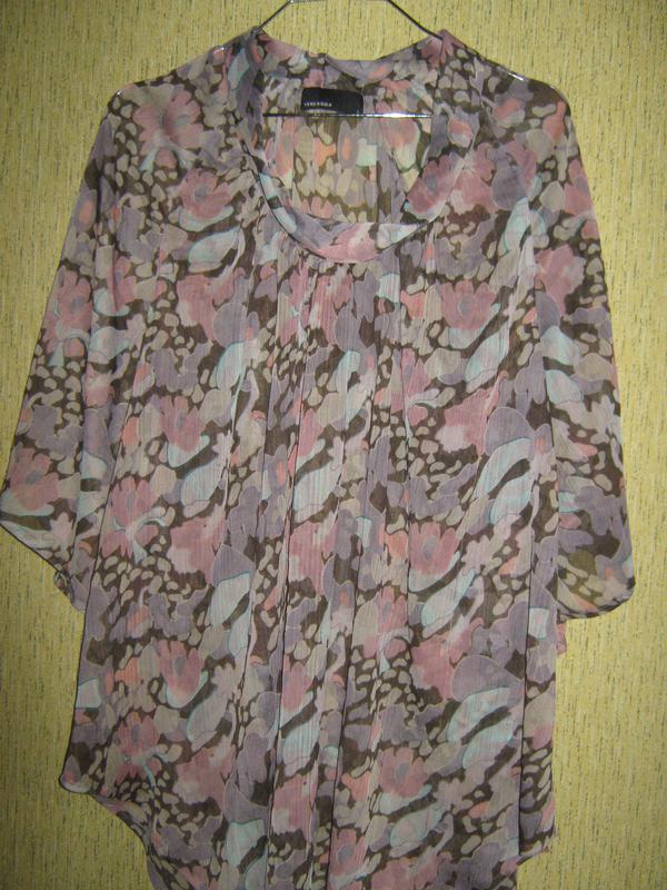 интересная расцветка шифон доминирует розово-фиолетовый цвет к низу идет розширение.
