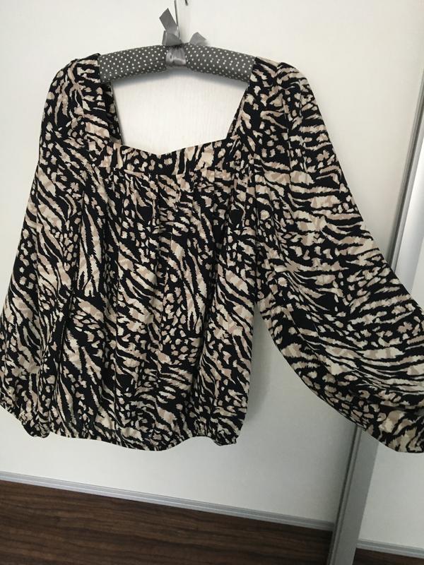 Стильна блузка з обємними рукавами і квадратним вирізом в ідеальному стані, ткагина 100% віскоза., внизу і на рукавах резинка, розмір вказано 12. Заміри: ПО під рукавами 49, рукав 60 ,довжина 59см.