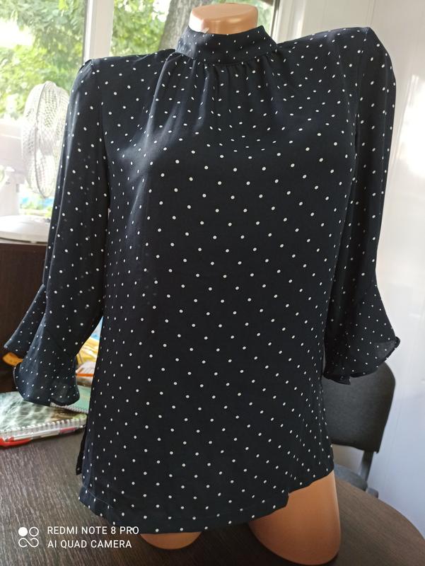 очаровательная кофточка в всегда актуальный горошек ,рукав укорочен с красивой оборочкой.пог47,пот45,поб49, разрезики длинна 64