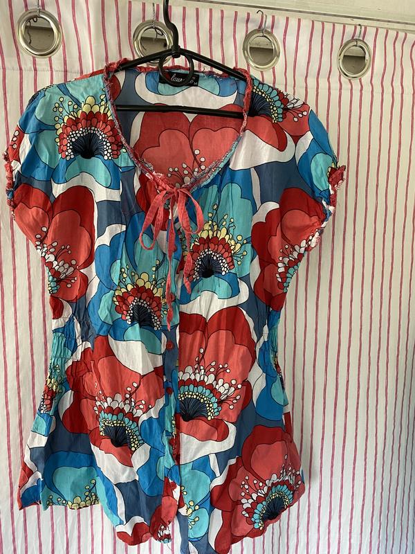 Яскрава і легка блузка з натуральної тканини. Спереду на гудзиках, по боках є вшиті гумки на талії Додаткові фото та заміри роблю при потребі. Є багато інших товарів у мене на сторінці