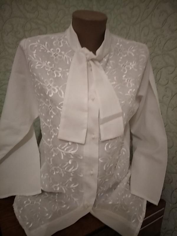 Блуза женская....выглядит очень очень нарядно и торжественно благодаря вышивке ришелье спереди .... имеет спереди застёжки жемчужинки и завязки на воротничке крой свободный и ровный замеры дам в смс и перешлю любой почтой