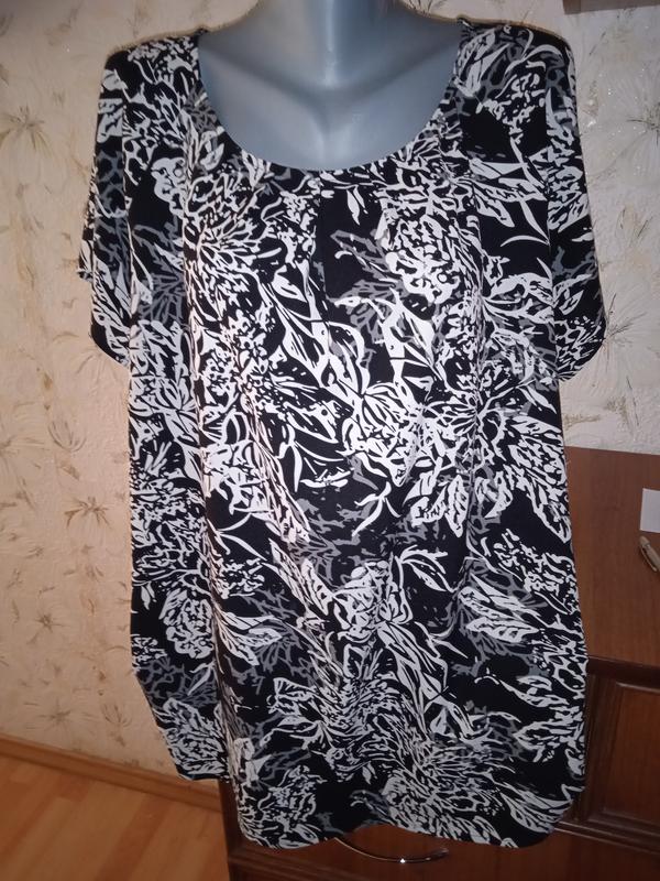 Евро размер 48, смотрите замеры. Ткань тонкая, не просвечивает, не тянется, 100% полиэстер. Состояние хорошее, есть несколько зацепок - видно на последнем фото, но на фоне рисунка в глаза не бросаются. Длина от верхней точки плеча к низу 75. Длина рукава от горловины 25. П/о внизу рукава 22. П/о груди, измеряла по спине 65. П/о талии, измеряла по спине 66. П/о внизу, измеряла по спине 67. 25.