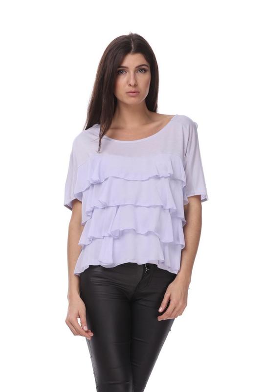 Необычный укороченый топ оверсайз, интересного фасона с жоржетовыми рюшами. Цвет нежно сиреневый. Холодящая струящаяся ткань, очень приятная к телу. Рукав цельнокроеный: летучая мышь.