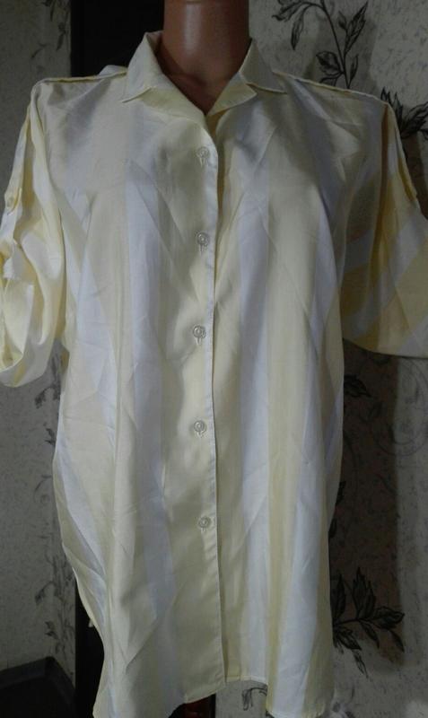 Очень лёгкая,приятная рубашка - блузка,размер 46 - 48, (смотрите замеры!), плечи 42 см, ог 52 - 54 см, рукав 27 см, длина спереди 68 см, длина сзади 75 см