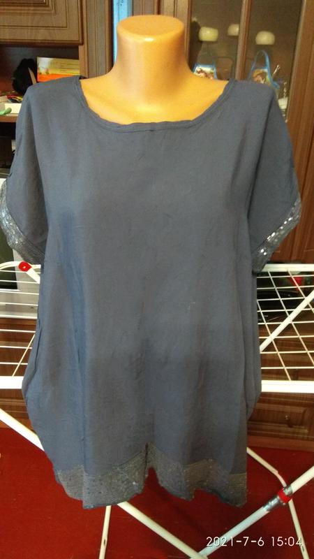 Блуза 54-56 размер, низ впереди и рукава отделаны пайетками, местами пайетки отсутствуют, спинка удлинена, общее состояние очень хорошее.