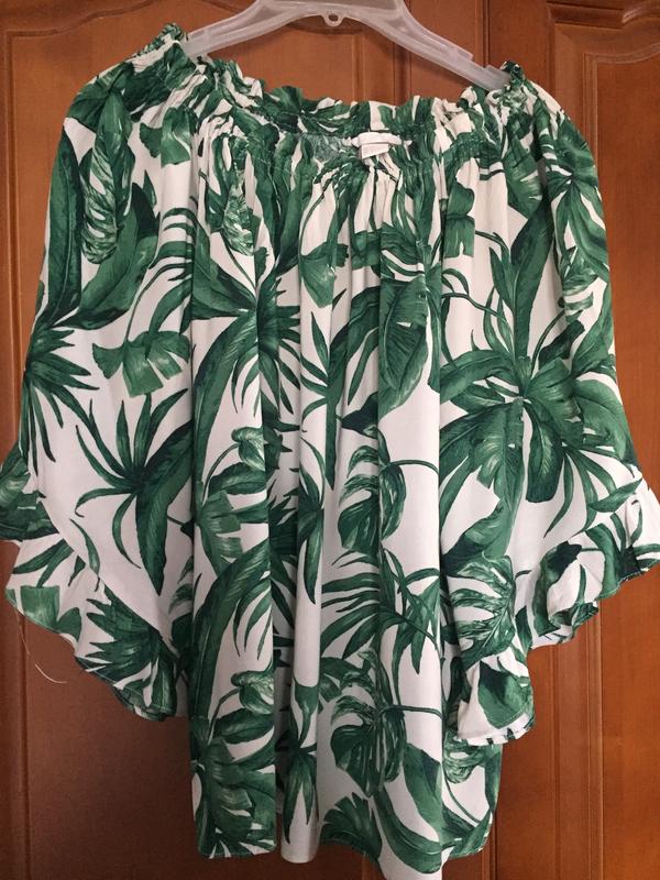 Легка літня блуза H&M тропічний принт. Вільний фасон, об'ємні рукави, горловина на резинці, можна носити з відкритими плічками. Розмір вказано 34,підійде і на 36. Довжина 63, пахви 53, рукав 39 від горловини,розширений, напівобхват низ 53.Віскоза
