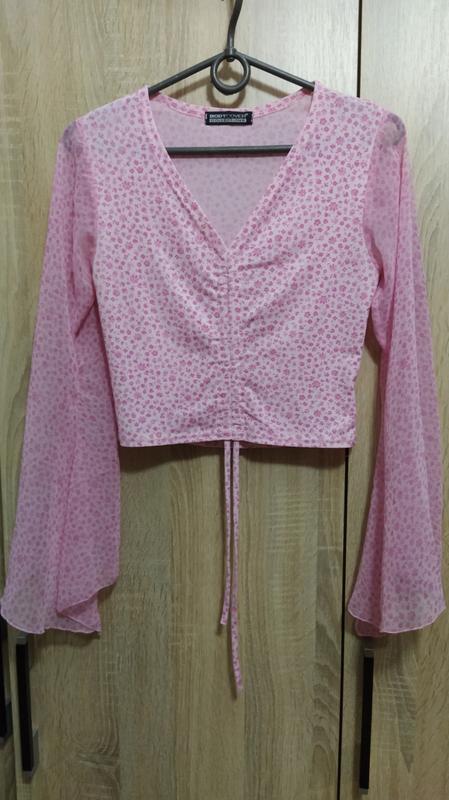 Блуза укороченная с прозрачными рукавами в хорошем состоянии, очень красиво смотрится как под шорты, так и под брюки/юбку, подойдёт на S и M .