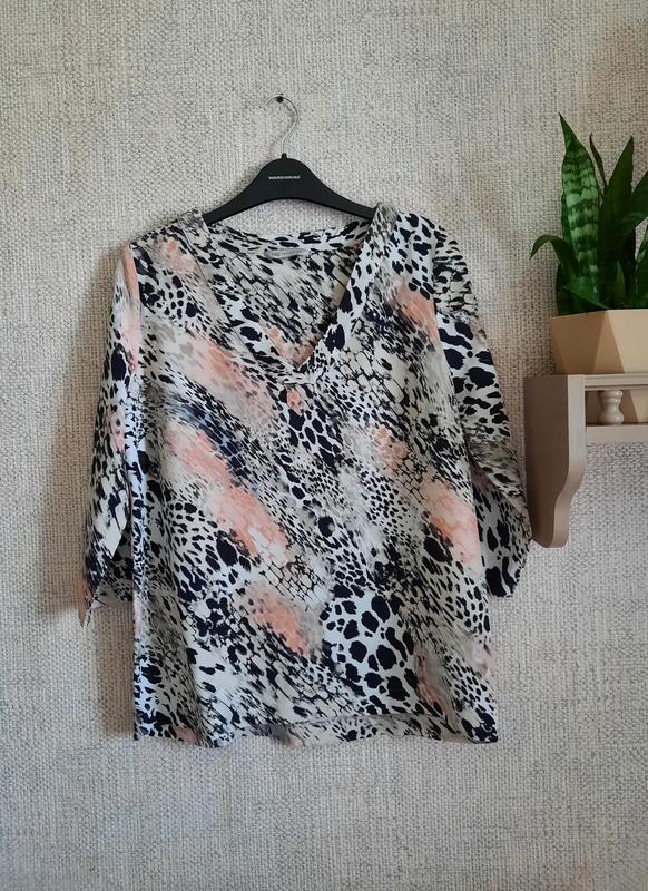 Жіноча нарядна блуза в принт. Дуже красива та ніжна. Хорошої якості, легенька. З V-подібним вирізом. Стан нової. Без дефектів. Розмір на бірці: UK 12. Заміри: Плечі: 35 см. ПОГ: 49 см. Довжина по спинці: 60 см. Довжина рукава від плеча: 43 см. Доставка: Висилаю через Нову Пошту, Укрпошту та Justin за рахунок отримувача після100% оплати на карту Приватбанк