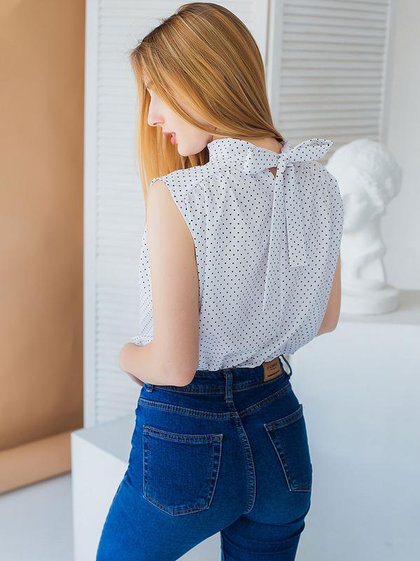 блузка в горох з бантом на спині біла в горох Материалы софт (100% полиэстер) Длина изделия S – 62 см, M - 63 см, L – 64 см Ширина под проймами S – 57 см, M - 59 см, L – 61 см Силуэт свободный