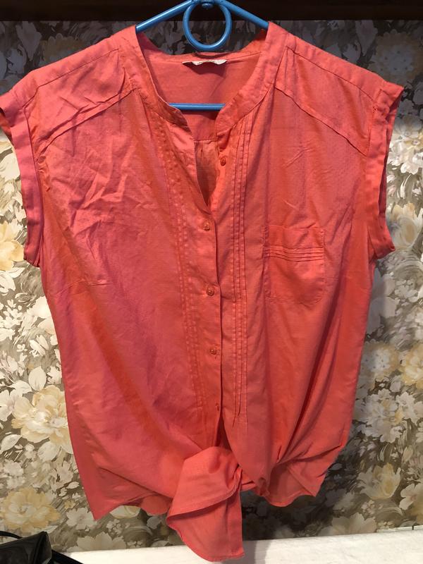 Красивый коралловый цвет,но не яркая.Очень легкая(напоминает батист).Рукавчик спущен.Внизу можно завязать,что делает ее кокетливо симпатичной