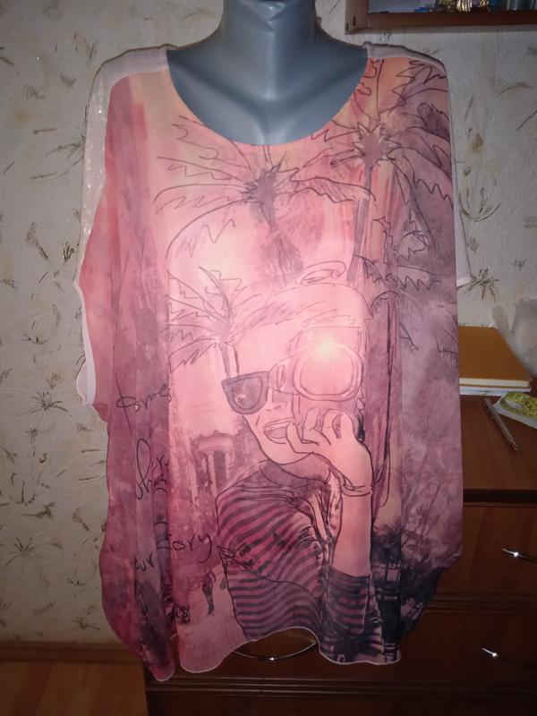 Размер XXL (52/54), смотрите замеры. Состояние отличное, без дефектов. Ткань шифон, есть трикотажная подкладка, 65% полиэстер, 35% хлопок. Длина от верхней точки плеча к низу 78. п/о выреза для руки на трикотажной подкладке 31 тянется до 38. п/о выреза для руки на шифоновой блузке 24. п/о груди и талии на трикотажной подкладке 63 тянется до 73. п/о груди на шифоновой блузке 94. п/о талии на шифоновой блузке 90. п/о внизу на трикотажной подкладке 66 тянется до 76. п/о внизу на шифоновой блузке 84. 45
