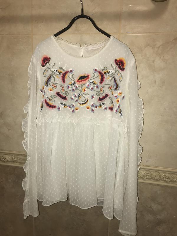 Блузка Zara молочного кольору з вишивкою та брижами на рукавах. Розмір-Xs( Xxs, S, маломірне M). Матеріал-полістер. 🔹Доставка Новою Поштою/Джастін. У випадку, якщо виникає потреба у додатковій інформації/ деталях, звертайтесь у приватні повідомлення.