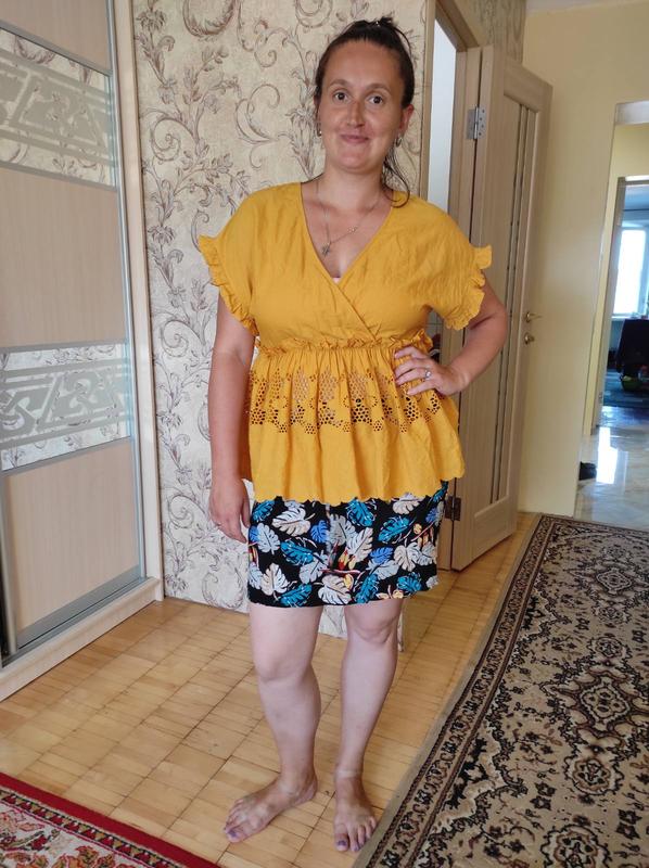 Яскрава блуза на резинці в талії. Глибоке декольте. Довжина 66 см.