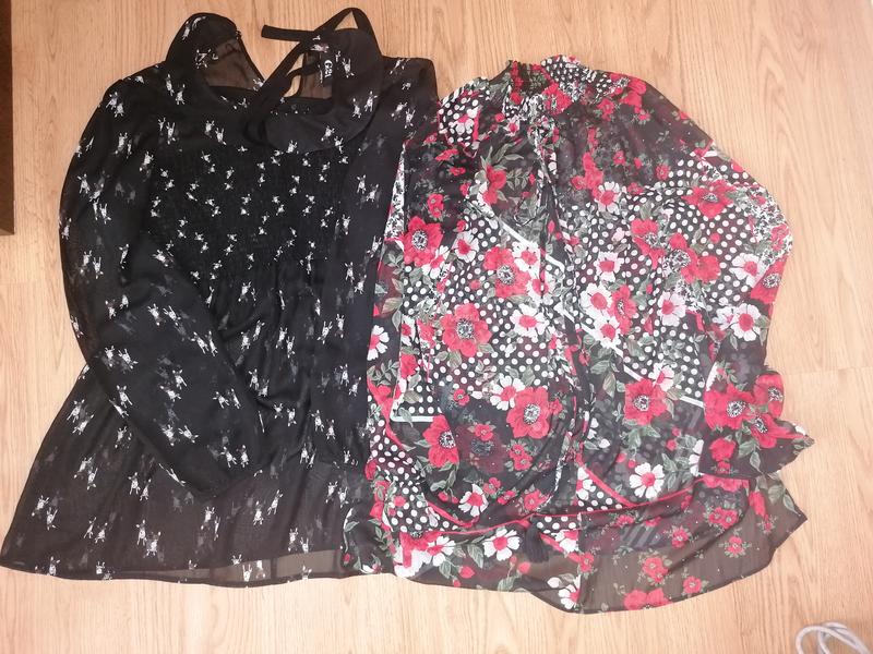 2 блузки(набор) Размер 16: Блузка с собачками: По груди полуобем 56+резинка Длина 71 Рукав 62 от плеча Блузка в цветы: Полуобем 56 Длина 71 Рукав от горловины 68