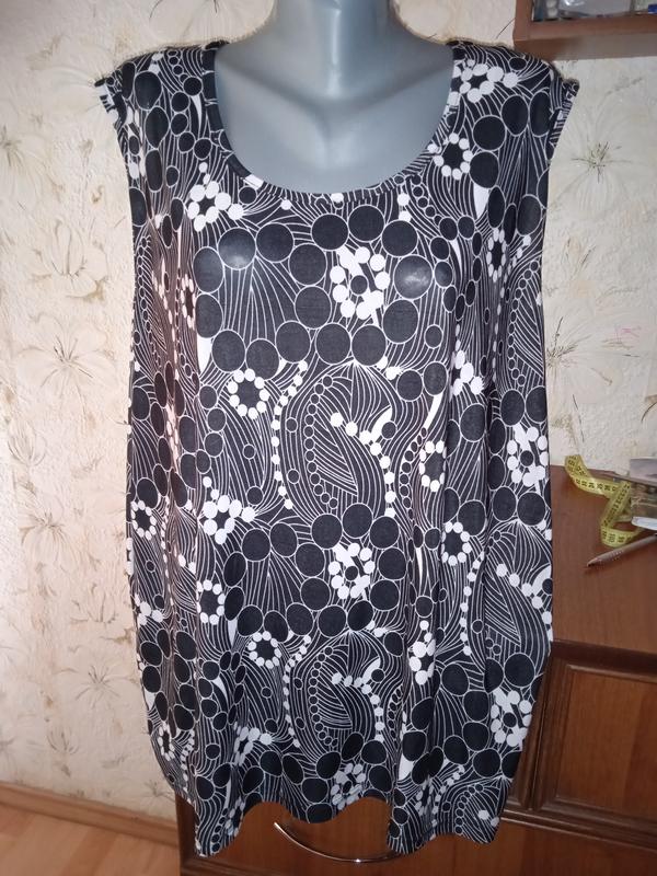 Размер на этикетке 4XL 52/54, смотрите замеры. Состояние очень хорошее, без дефектов. Ткань тонкая, хорошо тянется, трикотаж масло, 97% полиэстер, 3% эластан. Длина от верхней точки плеча к низу 75. П/о выреза для руки 32 тянется до 40. П/о груди и талии 70 тянется до 80. П/о внизу 71 тянется до 81. Ширина между плечевыми швами 47. 36.