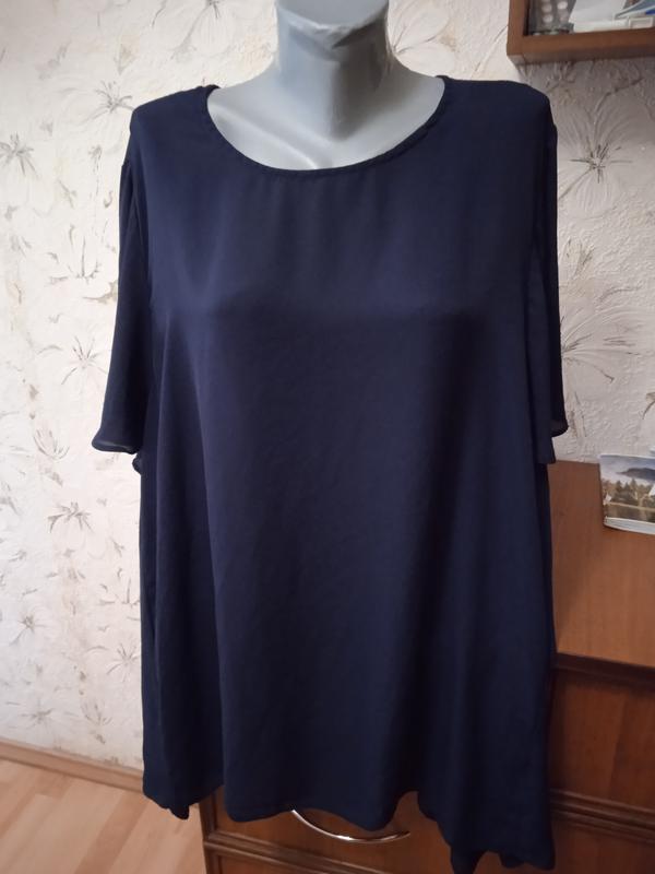 Размер на этикетке 52, смотрите замеры. Цвет темный синий. Ткань шифон, тонкая, не тянется, 100% полиэстер. Состояние отличное, без дефектов. Под рукавами присобрано, видно на фото 8. Длина от верхней точки плеча к низу 77. Длина рукава от плечевого шва 24. П/о бицепса 30. П/о груди 71. П/о внизу 108. Ширина между плечевыми швами 46. 37.
